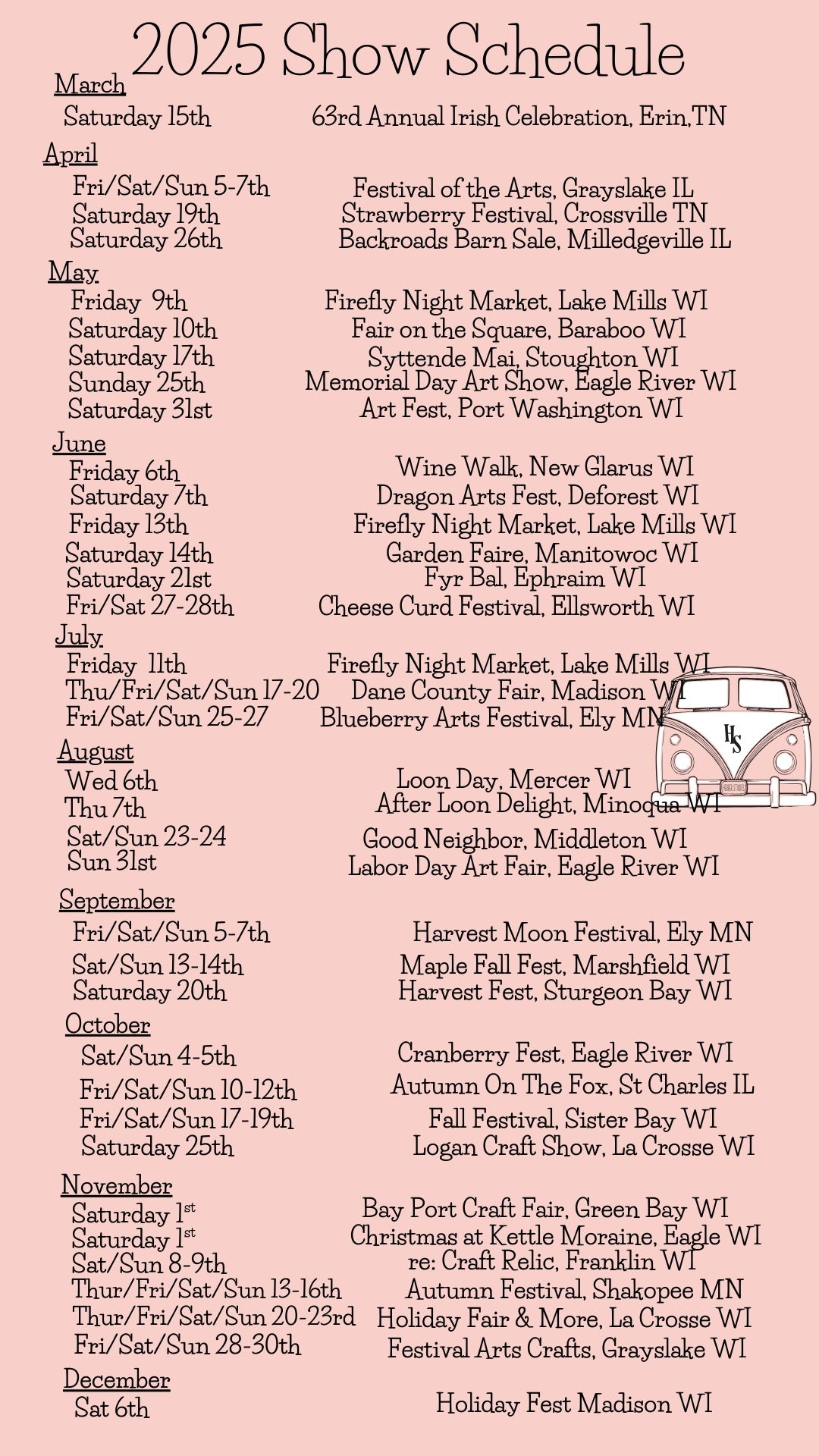 Did you know we start planning our show schedule all the way back in January? It’s a big puzzle, and we love piecing it together to bring our work to markets, festivals, and events near you! Be sure to check back often—our schedule is always evolving, and dates may shift as we receive confirmations.